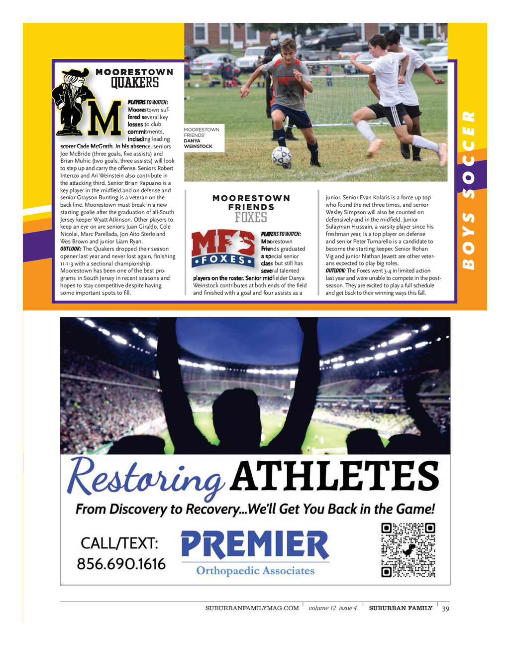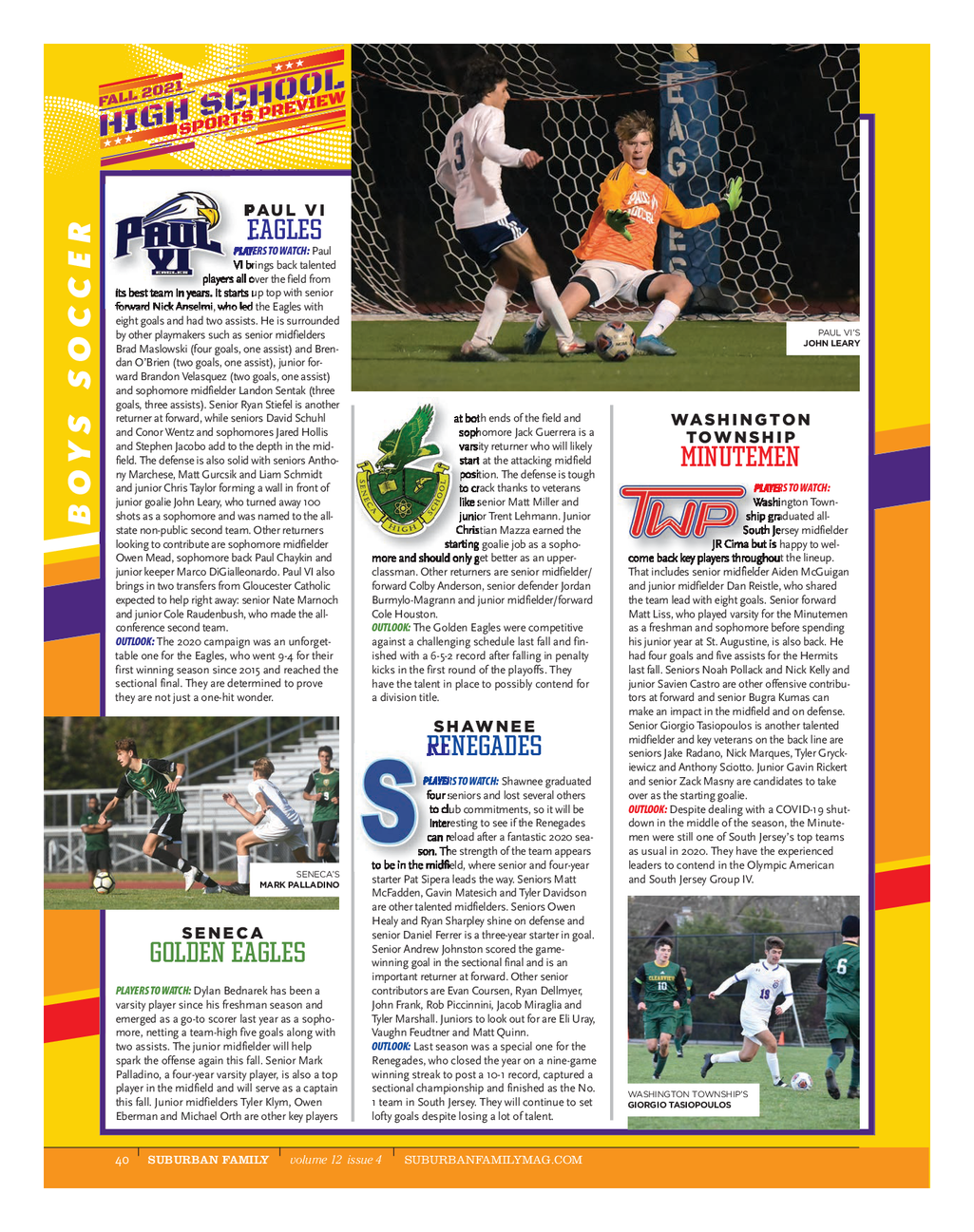 Fall Sports Preview 2021_BoysSoccer_Layout 1 8 / 5 / 21 2 : 21 PM Page 5 PAU L V I REAGLES PLAYERS TO WATCH : Paul E VI brings back talented players all over the field from its best team in years . It starts up top with Csenior forward Nick Anselmi , who led the Eagles with eight goals and had two assists . He is surrounded C PAUL VI’S by other playmakers such as senior midfielders JOHN LEARY Brad Maslowski ( four goals , one assist ) and Bren - O dan O’Brien ( two goals , one assist ) , junior for - ward Brandon Velasquez ( two goals , one assist ) S and sophomore midfielder Landon Sentak ( three goals , three assists ) . Senior Ryan Stiefel is another returner at forward , while seniors David Schuhl at both ends of the field and WAS H I N GTO N S and Conor Wentz and sophomores Jared Hollis sophomore Jack Guerrera is a TOW N S H I P and Stephen Jacobo add to the depth in the mid - varsity returner who will likely Y field . The defense is also solid with seniors Antho - start at the attacking midfield MINUTEMEN ny Marchese , Matt Gurcsik and Liam Schmidt position . The defense is tough and junior Chris Taylor forming to crack thanks to veterans a wall in front of PLAYERS TO WATCH : O like senior Matt Miller and junior goalie John Leary , who turned away 100 Washington Town - junior Trent Lehmann . Junior shots as a sophomore and was named to the all - ship graduated all - B Christian Mazza earned the state non - public second team . Other returners South Jersey midfielder starting goalie job as a sopho - looking to contribute are sophomore midfielder JR Cima but is happy to wel - more and should only get better as an upper - Owen Mead , sophomore back Paul Chaykin and come back key players throughout the lineup . classman . Other returners are senior midfielder / junior keeper Marco DiGialleonardo . Paul VI also That includes senior midfielder Aiden McGuigan forward Colby Anderson , brings in two transfers from Gloucester Catholic senior defender Jordan and junior midfielder Dan Reistle , who shared expected to help right away : senior Nate Marnoch Burmylo - Magrann and junior midfielder / forward the team lead with eight goals . Senior forward and junior Cole Raudenbush , who made the all - Cole Houston . Matt Liss , who played varsity for the Minutemen conference second team . OUTLOOK : The Golden Eagles were competitive as a freshman and sophomore before spending OUTLOOK : The 2020 campaign was an unforget - against a challenging schedule last fall and fin - his junior year at St . Augustine , is also back . He table one for the Eagles , who went 9 - 4 for their ished with a 6 - 5 - 2 record after falling in penalty had four goals and five assists for the Hermits first winning season since 2015 and reached the kicks in the first round of the playoffs . They last fall . Seniors Noah Pollack and Nick Kelly and sectional final . They are determined to prove have the talent in place to possibly contend for junior Savien Castro are other offensive contribu - they are not just a one - hit wonder . a division title . tors at forward and senior Bugra Kumas can make an impact in the midfield and on defense . Senior Giorgio Tasiopoulos is another talented S H AW N E E midfielder and key veterans on the back line are RENEGADES seniors Jake Radano , Nick Marques , Tyler Gryck - iewicz and Anthony Sciotto . Junior Gavin Rickert and senior Zack Masny are candidates to take PLAYERS TO WATCH : Shawnee graduated over as the starting goalie . four seniors and lost several others OUTLOOK : Despite dealing with to club commitments , so it will be a COVID - 19 shut - interesting to see if the Renegades down in the middle of the season , the Minute - can reload after a fantastic 2020 sea - men were still one of South Jersey’s top teams son . The strength of the team appears as usual in 2020 . They have the experienced to be in the midfield , where senior and four - year leaders to contend in the Olympic American SENECA’S starter Pat Sipera leads the way . Seniors Matt and South Jersey Group IV . MARK PALLADINO McFadden , Gavin Matesich and Tyler Davidson are other talented midfielders . Seniors Owen Healy and Ryan Sharpley shine on defense and senior Daniel Ferrer is S E N E C A a three - year starter in goal . Senior Andrew Johnston scored the game - GOLDEN EAGLES winning goal in the sectional final and is an important returner at forward . Other senior contributors are Evan Coursen , Ryan Dellmyer , PLAYERS TO WATCH : Dylan Bednarek has been a John Frank , Rob Piccinnini , Jacob Miraglia and varsity player since his freshman season and Tyler Marshall . Juniors to look out for are Eli Uray , emerged as a go - to scorer last year as a sopho - Vaughn Feudtner and Matt Quinn . more , netting a team - high five goals along with OUTLOOK : Last season was a special one for the two assists . The junior midfielder will help Renegades , who closed the year on a nine - game spark the offense again this fall . Senior Mark winning streak to post a 10 - 1 record , captured a Palladino , a four - year varsity player , is also a top sectional championship and finished as the No . player in the midfield and will serve as a captain WASHINGTON TOWNSHIP’S 1 team in South Jersey . They will continue to set this fall . Junior midfielders Tyler Klym , Owen GIORGIO TASIOPOULOS lofty goals despite losing a lot of talent . Eberman and Michael Orth are other key players 40 SUBURBAN FAMILY volume 12 issue 4 SUBURBANFAMILYMAG.COM