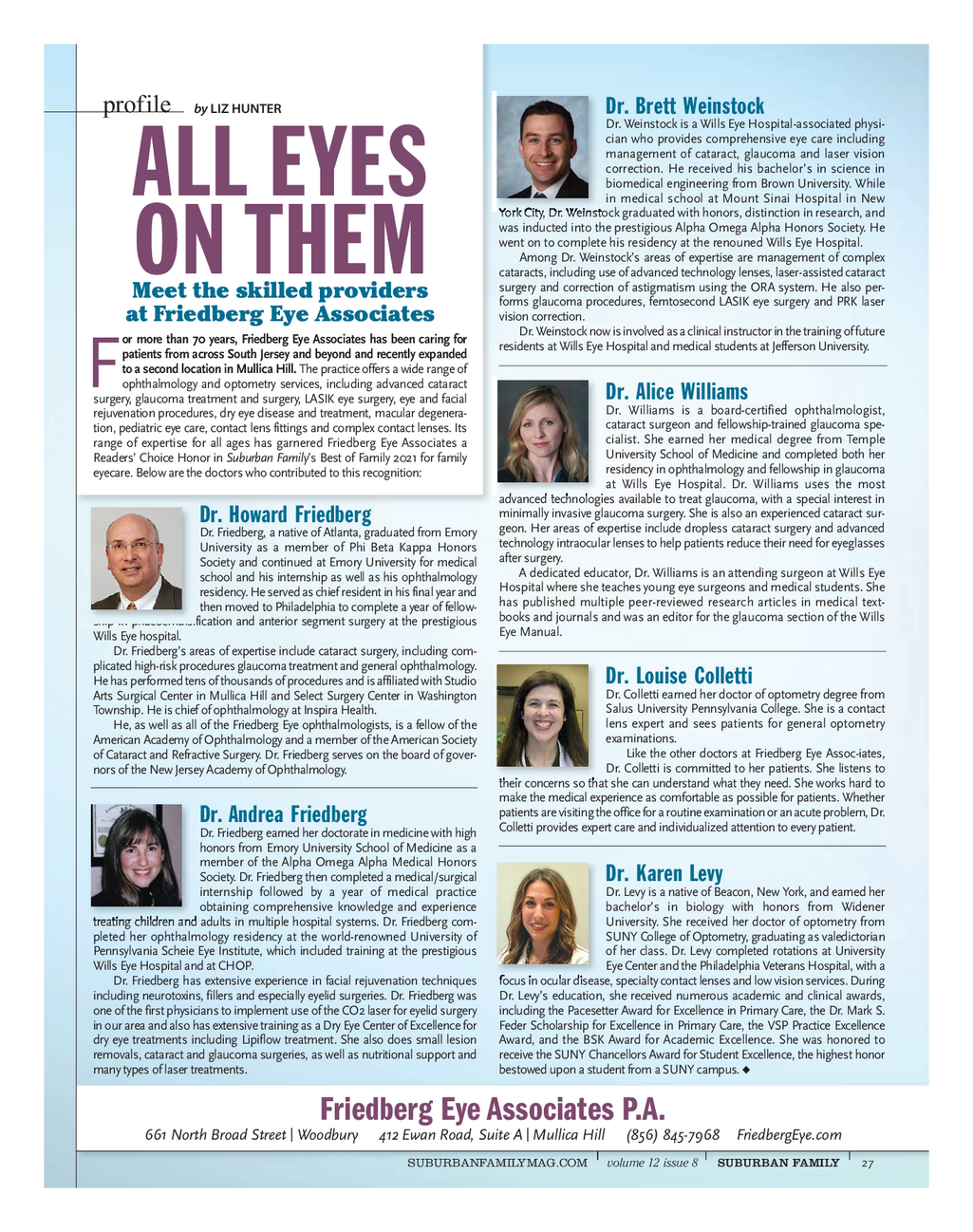 SF_Friedberg_Eye_Profile_1121_Profile 12 / 7 / 21 2 : 57 PM Page 1 profile by LIZ HUNTER Dr . Brett Weinstock Dr . Weinstock is a Wills Eye Hospital - associated physi - cian who provides comprehensive eye care including management of cataract , glaucoma and laser vision correction . He received his bachelor’s in science in biomedical engineering from Brown University . While ALL EYES in medical school at Mount Sinai Hospital in New York City , Dr . Weinstock graduated with honors , distinction in research , and was inducted into the prestigious Alpha Omega Alpha Honors Society . He went on to complete his residency at the renouned Wills Eye Hospital . Among Dr . Weinstock’s areas of expertise are management of complex ON THEM cataracts , including use of advanced technology lenses , laser - assisted cataract surgery and correction of astigmatism using the ORA system . He also per - Meet the skilled providers forms glaucoma procedures , femtosecond LASIK eye surgery and PRK laser vision correction . at Friedberg Eye Associates Dr . Weinstock now is involved as a clinical instructor in the training of future or more than 70 years , Friedberg Eye Associates has been caring for residents at Wills Eye Hospital and medical students at Jefferson University . patients from across South Jersey and beyond and recently expanded to a second location in Mullica Hill . The practice offers a wide range of Fophthalmology and optometry services , including advanced cataract Dr . Alice Williams surgery , glaucoma treatment and surgery , LASIK eye surgery , eye and facial Dr . Williams is a board - certified ophthalmologist , rejuvenationprocedures , dry eye disease and treatment , macular degenera - cataract surgeon and fellowship - trained glaucoma spe - tion , pediatric eye care , contact lens fittings and complex contact lenses . Its cialist . She earned her medical degree from Temple range of expertise for all ages has garnered Friedberg Eye Associates a University School of Medicine and completed both her Readers ’ Choice Honor in Suburban Family’s Best of Family 2021 for family residency in ophthalmology and fellowship in glaucoma eyecare.Below are the doctors who contributed to this recognition : at Wills Eye Hospital . Dr . Williams uses the most advanced technologies available to treat glaucoma , with a special interest in minimally invasive glaucoma surgery . She is also an experienced cataract sur - Dr . Howard Friedberg geon . Her areas of expertise include dropless cataract surgery and advanced Dr.Friedberg , a native of Atlanta , graduated from Emory technologyintraocular lenses to help patients reduce their need for eyeglasses University as a member of Phi Beta Kappa Honors after surgery . Society and continued at Emory University for medical Adedicated educator , Dr . Williams is an attending surgeon at Wills Eye school and his internship as well as his ophthalmology Hospitalwhere she teaches young eye surgeons and medical students . She residency.He served as chief resident in his final year and has published multiple peer - reviewed research articles in medical text - thenmoved to Philadelphia to complete a year of fellow - booksand journals and was an editor for the glaucoma section of the Wills ship in phacoemulsification and anterior segment surgery at the prestigious EyeManual . Wills Eye hospital . Dr . Friedberg’s areas of expertise include cataract surgery , including com - plicated high - risk procedures glaucoma treatment and general ophthalmology . Dr . Louise Colletti Hehas performed tens of thousands of procedures and is affiliated with Studio Dr . Colletti earned her doctor of optometry degree from Arts Surgical Center in Mullica Hill and Select Surgery Center in Washington Salus University Pennsylvania College . She is a contact Township.He is chief of ophthalmology at Inspira Health . lens expert and sees patients for general optometry He , as well as all of the Friedberg Eye ophthalmologists , is a fellow of the examinations . AmericanAcademy of Ophthalmology and a member of the American Society Like the other doctors at Friedberg Eye Assoc - iates , of Cataract and Refractive Surgery . Dr . Friedberg serves on the board of gover - Dr . Colletti is committed to her patients . She listens to nors of the New Jersey Academy of Ophthalmology . their concerns so that she can understand what they need . She works hard to make the medical experience as comfortable as possible for patients . Whether patients are visiting the office for a routine examination or an acute problem , Dr . Dr . Andrea Friedberg Collettiprovides expert care and individualized attention to every patient . Dr.Friedberg earned her doctorate in medicine with high honors from Emory University School of Medicine as a member of the Alpha Omega Alpha Medical Honors Society . Dr . Friedberg then completed a medical / surgical Dr . Karen Levy internship followed by a year of medical practice Dr.Levy is a native of Beacon , New York , and earned her obtaining comprehensive knowledge and experience bachelor’s in biology with honors from Widener treating children and adults in multiple hospital systems . Dr . Friedberg com - University . She received her doctor of optometry from pleted her ophthalmology residency at the world - renowned University of SUNYCollege of Optometry , graduating as valedictorian Pennsylvania Scheie Eye Institute , which included training at the prestigious of her class . Dr . Levy completed rotations at University Wills Eye Hospital and at CHOP . EyeCenter and the Philadelphia Veterans Hospital , with a Dr . Friedberg has extensive experience in facial rejuvenation techniques focusin ocular disease , specialty contact lenses and low vision services . During including neurotoxins , fillers and especially eyelid surgeries . Dr . Friedberg was Dr . Levy’s education , she received numerous academic and clinical awards , one of the first physicians to implement use of the CO2 lase