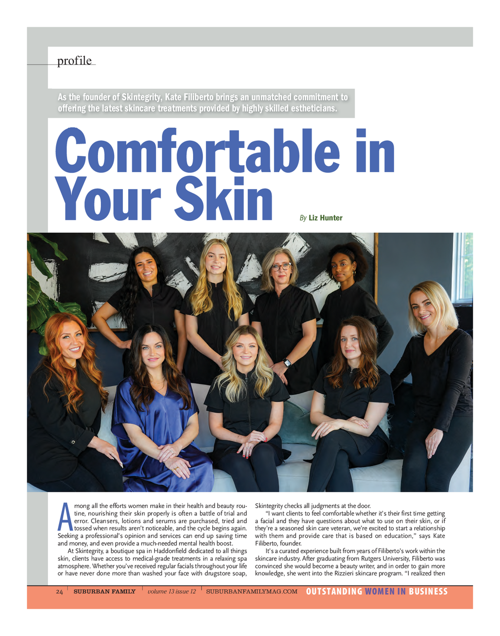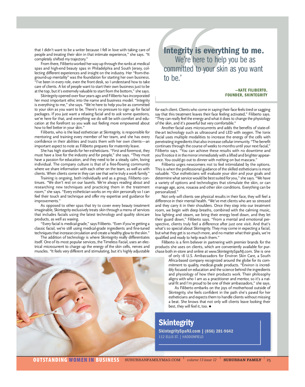 SF_Skintebrity_0523b_Profile 5 / 19 / 23 12 : 55 PM Page 2 that I didn’t want to be a writer because I fell in love with taking care of Integrity is everything to me . people and treating their skin in that intimate experience , ” she says . “ It completely shifted my trajectory . ” We’re here to help you be as From there , Filiberto worked her way up through the ranks at medical spas and high - end beauty spas in Philadelphia and South Jersey , col - committed to your skin as you want lecting different experiences and insight on the industry . Her “ from - the - ground - up mentality ” was the foundation for starting her own business . to be . ’ “ I’ve been in every role , even the front desk , so I understand how to take care of clients . A lot of people want to start their own business just to be — KATE FILIBERTO , at the top , but it’s extremely valuable to start from the bottom , ” she says . FOUNDER , SKINTEGRITY Skintegrity opened over four years ago and Filiberto has incorporated her most important ethic into the name and business model . “ Integrity is everything to me , ” she says . “ We’re here to help you be as committed to your skin as you want to be . There’s no pressure to sign up for facial for each client . Clients who come in saying their face feels tired or sagging packages . If you just want a relaxing facial and to ask some questions , say that this treatment leaves their face feeling activated , ” Filiberto says . we’re here for that , and everything we do will be with comfort and edu - “ They can really feel the energy and what it does to change the physiology cation at the forefront so you walk out feeling more empowered about of the skin , and it’s powerful but very comfortable . ” how to feel better in your skin . ” Another facial uses microcurrents and adds the benefits of state - of - Filiberto , who is the lead esthetician at Skintegrity , is responsible for the - art technology such as ultrasound and LED with oxygen . The Ionix mentoring and training every member of her team , and she has every Facial uses multiple modalities to increase the energy of the cells with confidence in their abilities and trusts them with her own clients — an penetrating ingredients that also increase cellular immunity . “ The benefit important aspect to note as Filiberto prepares for maternity leave . continues through the course of weeks to months until your next facial , ” She has high standards for her estheticians . “ First and foremost , they Filiberto says . “ You can achieve these results with no downtime and must have a love for the industry and for people , ” she says . “ They must you’ll notice it in the mirror immediately with a lifted and brighter appear - have a passion for education , and they need to be a steady , calm , loving ance . You could go out to dinner with nothing on but mascara . ” individual . The company culture is that of a free - flowing community Filiberto urges newcomers not to feel intimidated by the options . where we share information with each other on the team , as well as with This is when the professional guidance of the skilled estheticians is most clients . When clients come in they can see that we’re truly a work family . ” valuable . “ Our estheticians will evaluate your skin and your goals and Training is ongoing , both individually and as a group , Filiberto con - determine what service would be best suited for you , ” she says . “ We have tinues . “ We don’t rest on our laurels . We’re always reading about and a variety of options and technologies that stimulate the skin , or can researching new techniques and practicing them in the treatment manage age , acne , rosacea and other skin conditions . Everything can be room , ” she says . “ Every esthetician works on my skin personally so I can personalized . ” feel their touch and technique and offer my expertise and guidance for Not only will clients see physical results in their face , they will feel a improvements . ” difference in their mental health . “ We’ve met clients who are so stressed As opposed to other spas that try to cover every beauty treatment and they carry it in their shoulders . Once they step into our treatment imaginable , Skintegrity exclusively treats skin through a menu of services room , we begin with deep breaths , combined with the calming music , that includes facials using the latest technology and quality skincare low lighting and steam , we bring their energy level down , and they let products , as well as waxing . their guard down , ” Filiberto says . “ From a mental and emotional per - “ Every facial is medical - grade , ” says Filiberto . “ Even if you’re getting a spective , clients truly feel a difference after just one visit . And that’s classic facial , we’re still using medical - grade ingredients and fine - tuned what’s so special about Skintegrity . They may come in expecting a facial , techniques that increase circulation and create a healthy glow to the skin . ” but what they get is so much more , and no matter what their goals , we’re The addition of technology is where Skintegrity really differentiates qualified and ready to help reach them . ” itself . One of its most popular services , the Timeless Facial , uses an elec - Filiberto is a firm believer in partnering with premier brands for the trical microcurrent to charge up the energy of the skin cells , nerves and products she uses on clients , which are conveniently available for pur - muscles . “ It feels very different and stimulating , but it’s highly adjustable chase both in - store and online at www.SkintegritySpaNJ.com . She is one of only 18 U.S . Ambassadors for Environ Skin Care , a South Africa - based company recognized around the globe for its com - mitment to quality , medical - grade products . “ Environ is incred - ibly focused on education and the sci